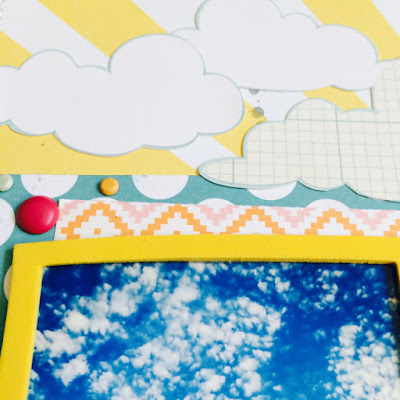 This is the paper I need to get again. I adore it. And there was no way I was going to cut into it so I had to come up with a design and subject that supported all that bright sunshine. I fussy cut out the clouds and just made a small cluster to back the photo. I die cut the polaroid frame out of the foam paper. There is some nice dimension on this layout even though it looks relatively flat.