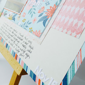 Here's my first layout channeling a little Shimelle with the diagonal stripe border around the edge and blocked paper! I definitely could have used at least two sheets of that stripe paper - loved it so much and the other side was a really lovely mint green. For this, I added some grey October Afternoon mini market letter stickers (like these but in another colour) and some mini BasicGrey alphas (I have some older ones but these are almost identical). Oh and of course, a little gold mist of course (see here).
